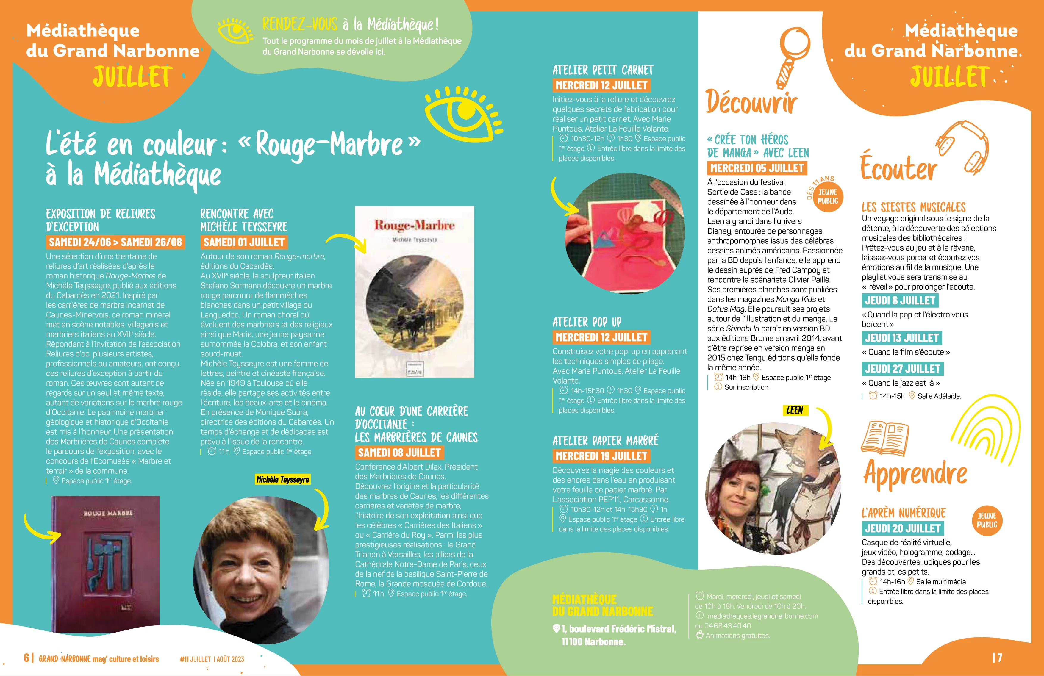 Médiathèque du Grand Narbonne du 24 juin au 26 août. Exposition de marbres et de reliures d’art réalisées à partir du roman de Michèle Teysseyre « Rouge-Marbre ». Les Rendez-vous à noter :